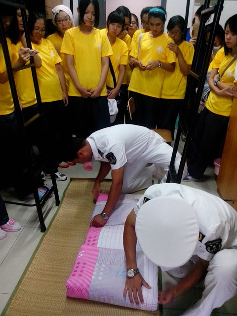 首先四位教官分别进入男、女生寝室指导被子的“军事化叠法”,教官们拿来两床被子,耐心细致的向同学们讲解,经过近10分钟的演示,同学们对教官“专业”的被子叠法也有了新的认识。而后教官们向同学们示范了物品的规范化摆放,不仅让寝室物品看起来规范有序,也同时让寝室环境变的干净整洁。最后教官们又向大家强调了养成良好作息习惯的重要性,在学习的同时也要注意进行有益的身体锻炼。
