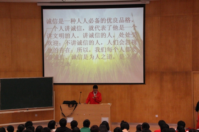 在活动中,朱老师首先强调了提升学生诚信素质,加强诚信教育的重要性,并指出诚实守信,是中华民族的传统美德和当今社会需要大力弘扬的道德规范,也是我校文化的重要内容之一。其次,朱老师引经据典,同时引用大家身边的例子,让同学明确诚信的重要。最后,朱老师呼吁同学们知诚信,讲诚信,从身边的小事做起,无论在学习、工作还是生活上,都要做到诚实守信,诚恳待人。