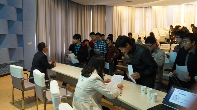 此次招聘活动一共分三部分。首先,蒋先生通过播放公司视频短片,结合PPT详细介绍了公司的发展历程、业务范围以及唐人街影院,并且着重讲解了公司对招聘人员的要求以及培养计划,让在座的同学对公司有一个更为全面直接的了解。然后,同学们对薪金、技术要求、录用比例等方面提出问题,公司做出了详细地解答。最后,公司进行了一对一简短的交流并收取了简历,从中初步筛选出想要招聘的人员。