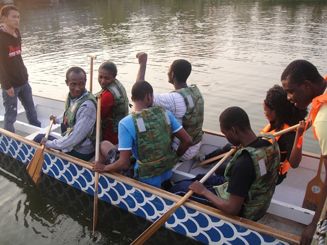 ur2young 在 周三, 11/28/2012 - 14:06 提交 2012年10月31日下午,交运学院组织加纳班留学生来到我校龙舟社学习划龙舟。 同学们首先穿上救生服并做了热身运动。然后宋海龙教练向留学生讲解了如何持桨、坐姿等基本动作。接下来留学生们跃跃欲试,坐进了龙舟里。宋教练特地安排几名龙舟队队员一同坐上船以防意外。河面顿时翻起了阵阵水浪,龙舟开始稳稳地向前划行。 本次学习活动在一片欢声笑语中结束,各位留学生特地询问了什么时间能够再次来龙舟社学习。作为一项富有特色的传统民俗文化活动,端午赛龙舟对于外国留学生具有独特的吸引力。