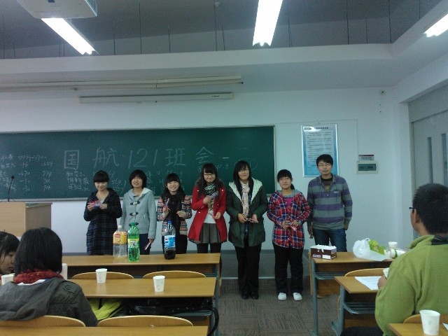 2012年11月23日上午,国航121班在教学区3b503教室举行班会活动,本次班会的主题是增强班级凝聚力,发挥各方优势特长,更好地建设国航121班。本次班会由班长杨克寒主持,辅导员朱红红老师、万京老师莅临本次班会。