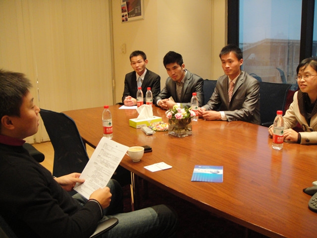 赵林和姚海先生首先介绍了挪威罗伦胜公司企业概况、企业选人标准以及企业应对经济整体形势低迷的方案。赵睿老师介绍了唐人街影院 概况和今年毕业班同学整体情况,并了解了目前在此企业实习的国航092班陈冬华等3名同学的工作情况。赵林和姚海先生还对走访同学提交的简历进行了点评并回答了同学们关于职业发展、船舶经纪行情等方面的问题。