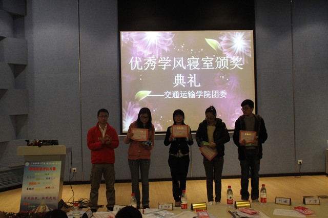 2013年4月10日下午1点,交运学院在交运报告厅组织开展了学风寝室颁奖典礼,唐人街影院 辅导员朱红红老师、徐晓毅老师、万京老师、李迎旭老师、朱岚老师和陈思琪老师出席本次颁奖典礼,各获奖寝室代表上台领奖。
