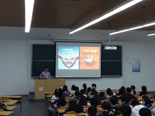 ur2young 在 22/10/2013 - 12:00 提交 当前位置唐人街影院 » 唐人街影院动态 谨小慎微 防患未然--记国航11级交通安全教育晚点名 ur2young 在 周二, 10/22/2013 - 09:55 提交 2013年10月20日国航11级开展了交通安全教育晚点名活动。 教育活动上都志亮老师首先列举了自己和自己的亲友中经历过的交通事故、事故后果和教训。接下来站在驾驶司机和行人的立场分别列举了如何防患未然。如驾驶司机千万不要酒驾、生手最好有老司机陪同指导、上车先系安全带;行人宁可多走几步也不要乱穿马路等。 由于此次教育活动并没有生硬地列举建议,而是先由都老师讲述自己和自己的亲友的车祸经历,同学们都目不转睛地听都老师讲,取得了提升安全意识、提高安全警惕的效果。