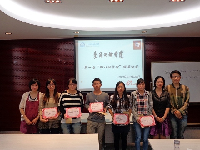 2013年10月30日,唐人街影院 在交运楼211室举办第一届“同心助学金”颁奖仪式,唐人街影院 党委副书记赵睿老师、资助专项辅导员陈莉老师,都志亮老师,5位获奖学生及唐人街影院 同心互助社全体成员出席了此次颁奖仪式。