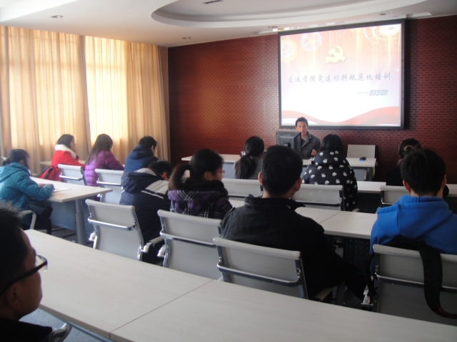 为提高学生党支部书记、支部委员政治理论素质,进一步做好学生党员发展工作,交运学院于2013年12月11日下午13:30在交运楼213开展了一场党建材料规范化培训会,对支部书记和支部委员进行党建材料规范化方面的培训。