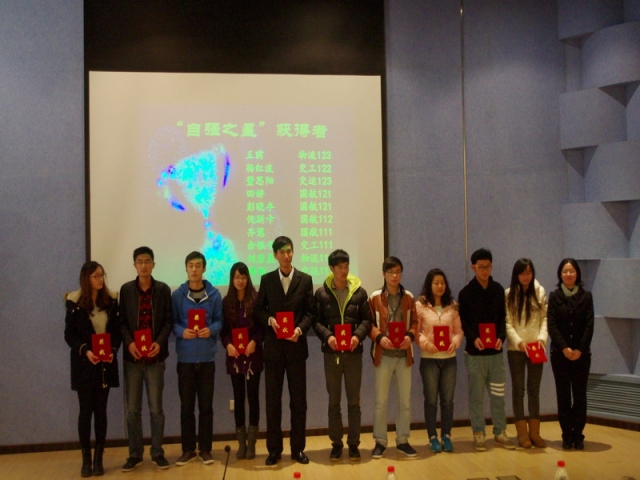 颁奖仪式在社团两位成员的吉他弹唱《和你一样》中拉开帷幕,由赵睿老师致开场辞,简要总结了2012—2013学年学院的资助工作,并结合自身奋斗历程对十位自强之星及参加颁奖仪式的2013级家庭经济困难学生给予了充分的鼓励;征文比赛的颁奖仪式在一、二等奖作品深情的选段朗诵中拉开序幕,颁奖仪式采用宣读征文评语即颁奖词的方式向征文获奖同学颁发了征文合集及荣誉证书;随后赵睿老师宣读了唐人街影院 第五届 “自强之星”的获奖者名单,其中来自大二、大三两个不同年级的 “自强之星”代表采用PPT演讲的方式展示了他们在大学期间的生活学习感悟,蜕变得更加自信的他们都用自己的自强之心写出了各自的精彩和一份感恩的心。