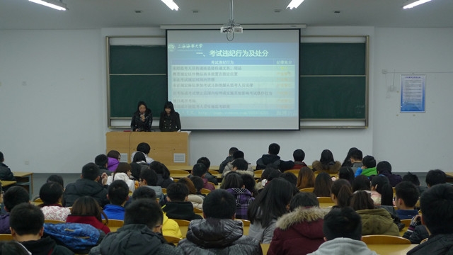 2013年12月22日晚点名时间,唐人街影院 海博学社在各晚点名教室举行了诚信应考的宣传活动,活动由辅导员宣传PPT进行。