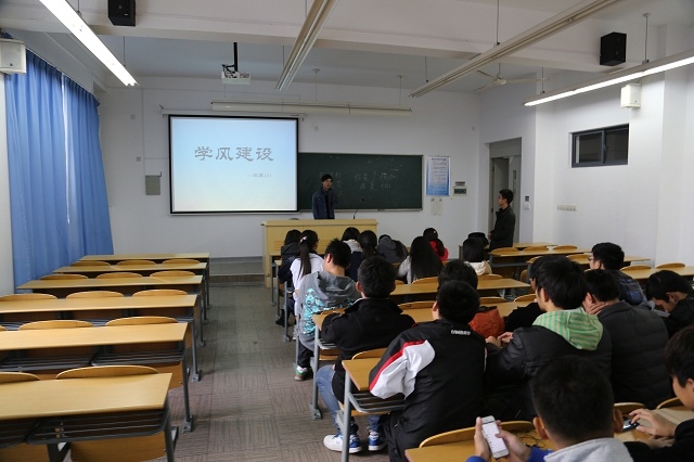 在学风主题班会上,首先,各班班长就各自班级现有学风建设做了详细总结和汇报,对开学一段时间以来同学们在晨跑、晚点名、上课出勤率和班级活动参与度等方面做了详细分析。接着,各班同学根据班长所言情况,共同商讨接下来的班级学风应该如何建设。各班同学积极发言,共同讨论出新的班级学风建设方案。最后,考虑到考试周的到来,此次学风班会特地增加了学习交流环节,针对同学们提出的一些学习上的问题,学习委员及成绩优异的同学针对这些疑问与同学们分享了自己的经验。大家做出承诺:要诚信考试,培养好的学习习惯,不迟到早退旷课,为打造优秀学风班级而努力。