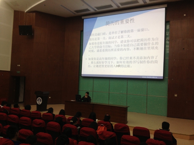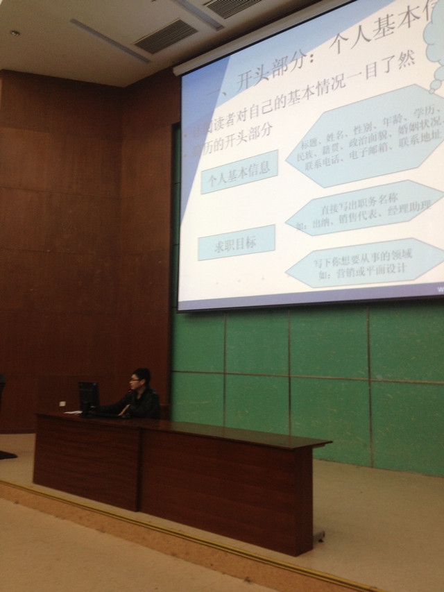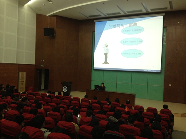 为了提升学生的简历制作能力,提高求职成功率,把握人生的第一块敲门砖。2014年3月16日晚,唐人街影院 辅导员徐晓毅老师在学生服务中心邦建报告厅开展了 “如何制作简历”的讲座。全体交工11级学生和管理13级学生参加了此次讲座。