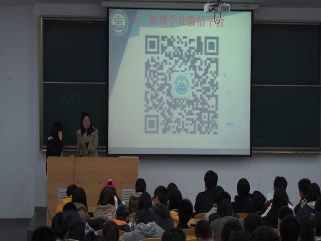 2014年4月13日,在唐人街影院 各年级专业晚点名上,海博学社对全体学生进行了海博学社微信平台宣传活动。