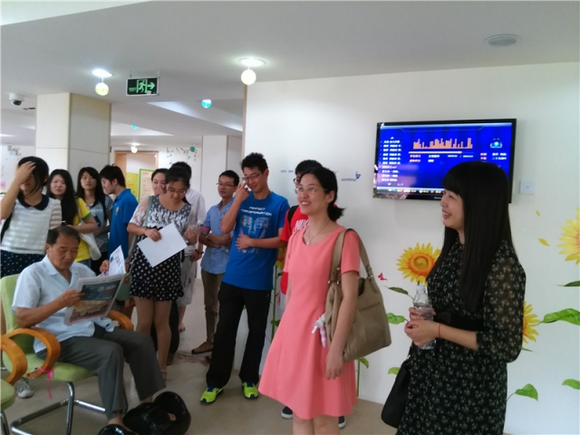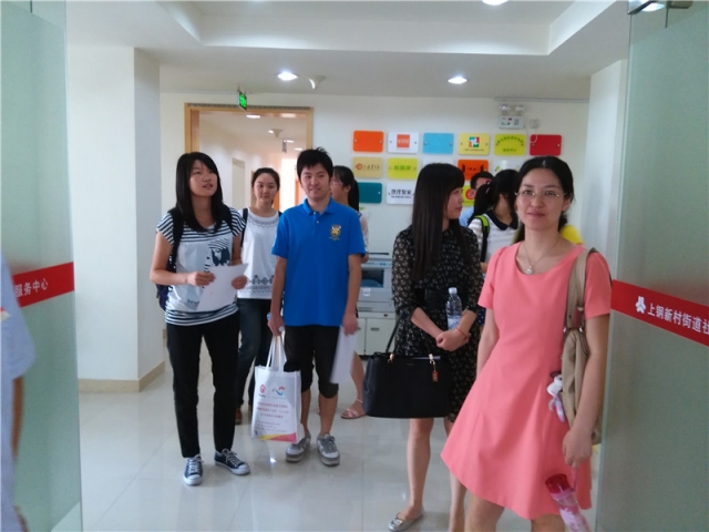 2014年9月12日上午11:00,在上钢街道团工委书记张菁老师的陪同下,唐人街影院 党委副书记赵睿老师以及辅导员朱红红老师带领雷锋驿站志愿者们一同参观了位于历城路上的上钢街道老年生活服务中心。