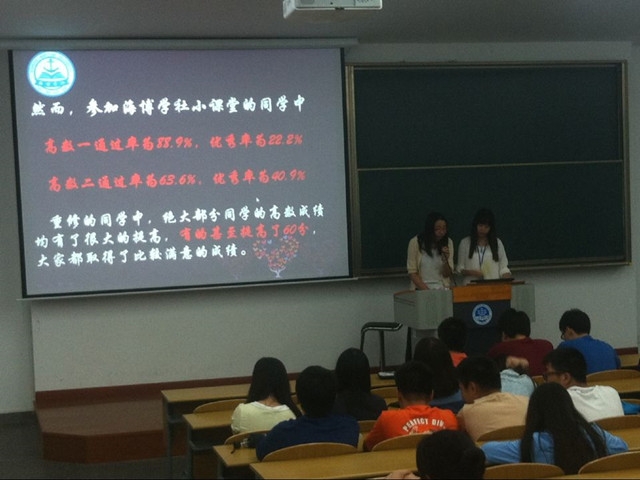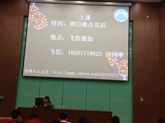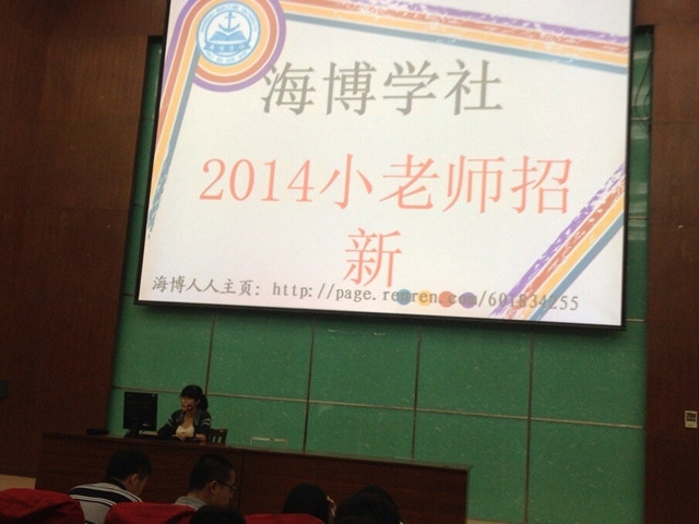 2014年9月21日晚,唐人街影院 海博学社利用晚点名的时间在各年级专业进行了海博小课堂宣传以及小老师招募活动。