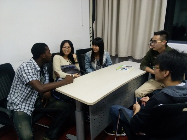 2014年10月23日星期四晚上,唐人街影院 12级物流管理专业的各班同学们与加纳班的同学们在唐人街影院 楼109进行了一次交流会,旨在提供国际交流生与中国学生的交流的机会,给予他们在海大学习生活上的帮助,建筑友谊的桥梁。