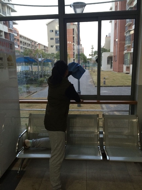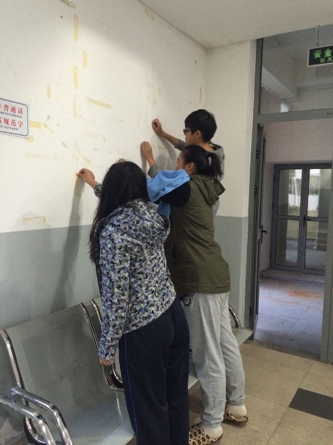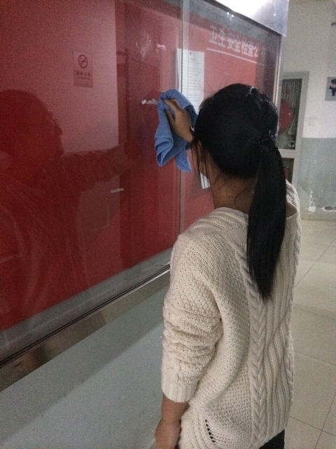 2014年 10月7日下午,50-51号楼社区的自管会学生在本楼门厅及过道橱窗开展了清洁工作,为即将开展的社区装饰活动做前期准备。