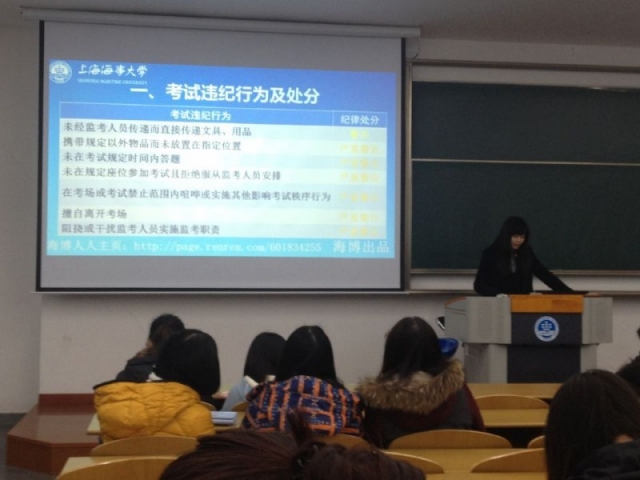 2015年1月3日,唐人街影院 海博学社在院各专业年级的晚点名上,对同学们进行了认真备考与诚信考试的宣传。
