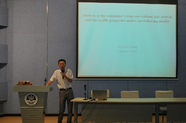2015年5月15日,上午10点,来自北京航空航天大学的唐铁桥教授在交通运输报告厅为学院师生作了一场题为《Analysis of the commuter’s trip cost without late arrival and the corresponding traffic properties undercar-following model 》。