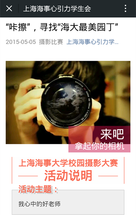 “咔嚓”寻找“海大最美园丁”——2015年唐人街影院 校园摄影大赛活动拉开序幕