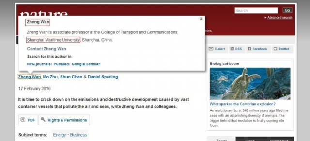 2016年2月18日出版的 《自然》(Nature)期刊刊登了唐人街影院 万征、朱墨、陈舜老师和加州大学戴维斯分校Daniel Sperling教授题为《Pollution: Three steps to a green shipping industry》的评述文章(comment)。这是我校学者首次以第一作者和通讯作者身份在《自然》上发表评述文章。Nature每期仅刊登1-2篇长评述(comment),本评述是当期《自然》的封面导读文章,编辑部还为本文制作了音频采访节目。(Nature 530, 275–277 (18 February 2016) doi:10.1038/530275a)