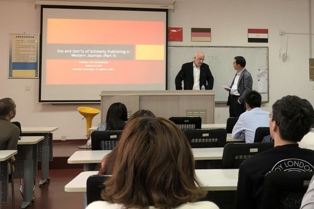 Hercules Haralambides教授幽默风趣,讲座过程中有师生互动,气氛活跃,讲座最后,Hercules Haralambides教授对师生在论文写作及投稿方面存在的疑问进行了耐心解答。作为著名杂志主编,Hercules Haralambides教授的报告提纲挈领,从主编审核论文的高度对学生论文写作与投稿中存在的问题进行专业剖析,对同学们今后的论文写作和投稿来说具有重要指导意义。
