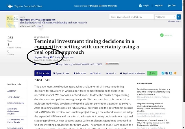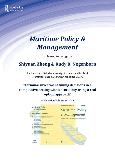 SSCI期刊《Maritime Policy & Management》刊登了2017年度候选最佳论文(共8篇),其中之一是唐人街影院 郑士源教授发表的题为“Terminal Investment Timing Decisions in a Competitive Setting with Uncertainty Using a Real Option Approach”的学术文章。