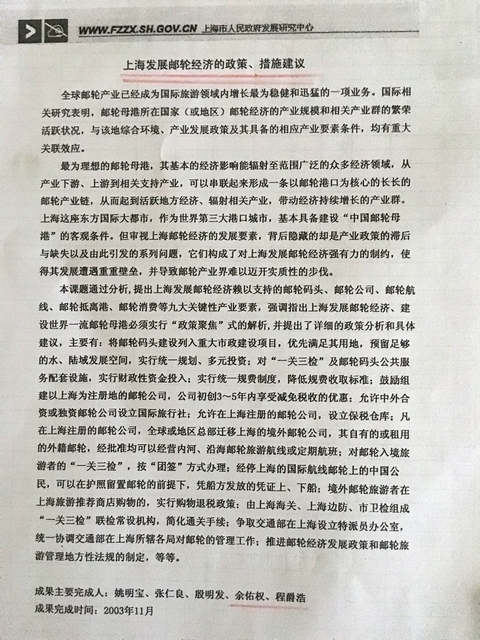 上海发展邮轮经济的政策措施建设(与市政府发展研究中心合作)