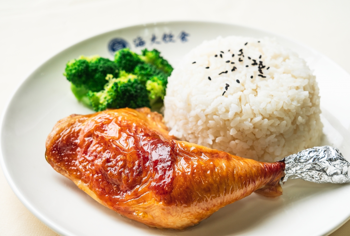 一只金黄中略带焦色的手枪形鸡腿,油亮亮地横卧在白米绿叶之上,一进餐厅就可以闻到那带洋葱味的烤鸡香。请一份坐下,用筷子轻轻挑开脆皮,一戳那白嫩的鸡肉,会渗出点点鲜汁并伴着香气扑鼻而来,食欲顿时大开。这是印记在我脑海中的海大鸡腿饭!