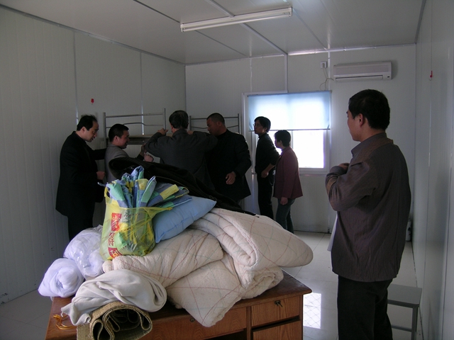 铺下了新校第一张床(图中右一为张永兴、右三为赵志勇)