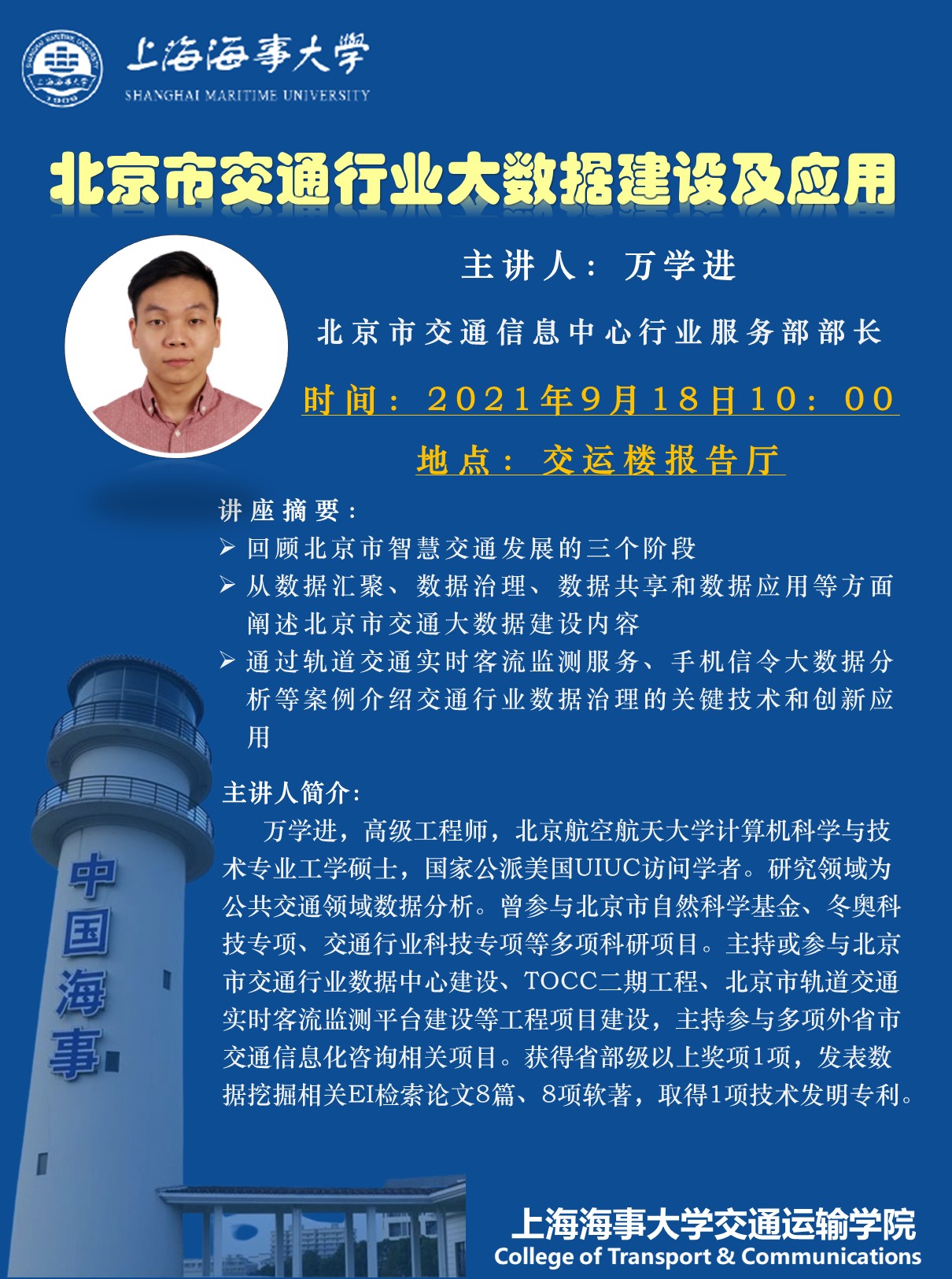 万学进,高级工程师,北京航空航天大学计算机科学与技术专业工学硕士,国家公派美国UIUC访问学者。研究领域为公共交通领域数据分析。曾参与北京市自然科学基金、冬奥科技专项、交通行业科技专项等多项科研项目。主持或参与北京市交通行业数据中心建设、TOCC二期工程、北京市轨道交通实时客流监测平台建设等工程项目建设,主持参与多项外省市交通信息化咨询相关项目。获得省部级以上奖项1项,发表数据挖掘相关EI检索论文8篇、8项软著,取得1项技术发明专利。